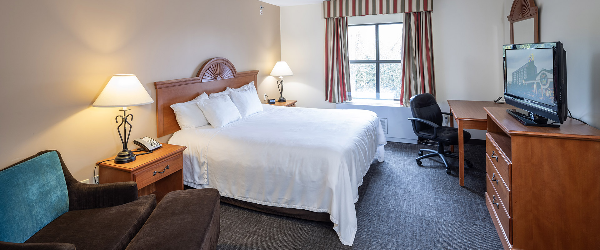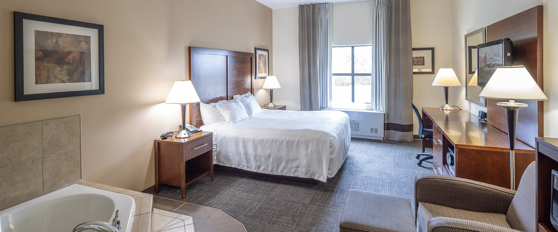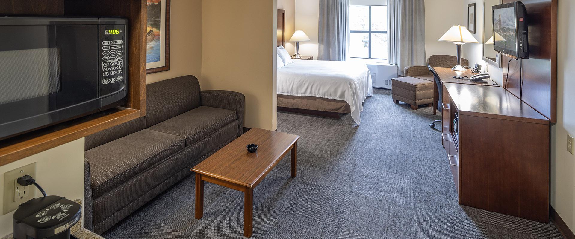 ত্রিমাত্রিক রুম দেখুনরাজা বা দুই রানীর বিছানা থেকে বেছে নিন । একটি দীর্ঘ জীবন্ত এলাকা যুক্ত করা, সাদা পোশাকে ভরা টিভি, ফ্রিজ, মাইক্রোওয়েভ, কফি নির্মাতা, নিরাপদ এবং একটি লেখা ডেস্ক।.