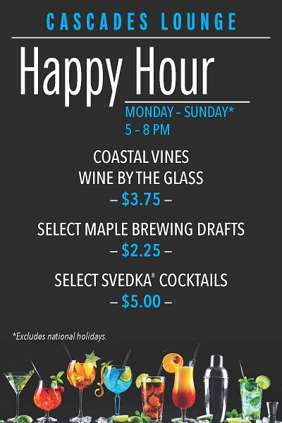 সোমবার থেকে রবিবার পর্যন্ত, ৫-৮ টা থেকে রবিবার পর্যন্ত কোন শুভ ঘন্টার বিশেষ সুবিধা নেই। ড্রেম্যান বার্গিং খসড়া বা হ্যান্ডক্রাফট ককটেল উপভোগ করে। তুমি বন্ধুদের সাথে তাল মিলিয়েছ, টেবিল থেকে বিরতি নিয়ে, অথবা শক্তি নির্গত করার জন্য শুধু শক্তির উপর বাজি ধরে, সপ্তাহের প্রতি রাতে ক্যাস লুঞ্জ জায়গা।.